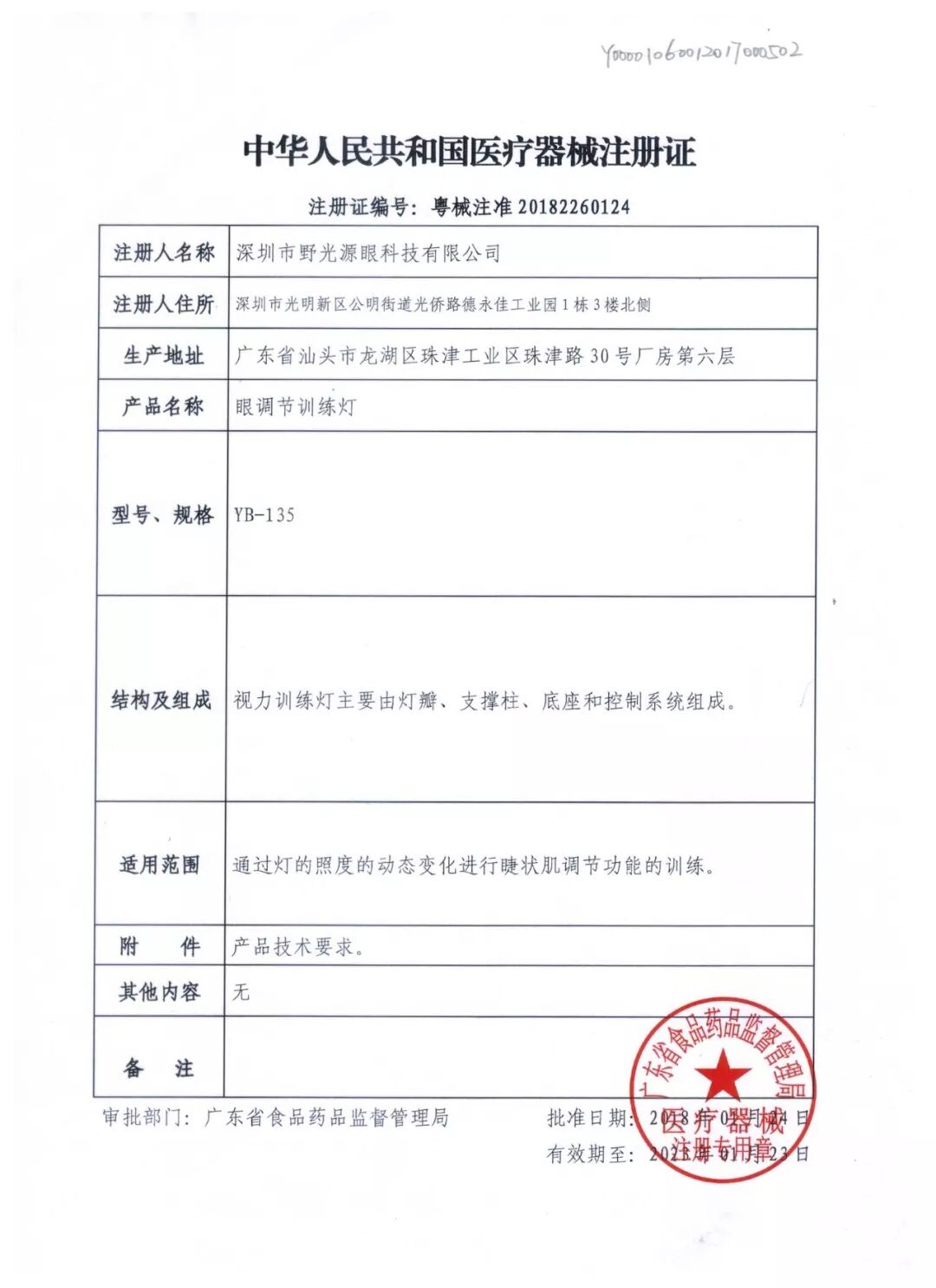 野光源视力训练灯经过四年的努力在各方人士的鼎力帮助下已完成了不同层面的专家论证,动物实验,主观实验,通过界定列入国家二类医疗器械目录,多中心临床试验,项目答辩,实地考察等程序;已于2018年1月24日获得国家二类医疗器械注册证。